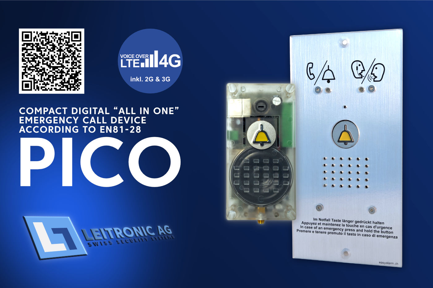 Our new PICO elevator emergency call system is an "all-in-one" emergency call device in intercom size. The PICO complies with the EN81-28 standard and has the mobile radio part integrated in a single unit with an extremely compact design. It is perfectly adapted for use in stairlifts, but can also be used wherever mobile radio reception is available directly at the intercom station, e.g. in outdoor lifts or cable cars. Despite its small dimensions, the fully digital PICO has integrated 4G / VoLTE. The PICO elevator emergency call system has connection options for external emergency contacts, intercom stations, misuse suppression and Android cell phones with the Leitronic EasyConfig app for reception optimization.